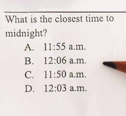 This question is an interesting exercise in understanding and interpreting time, particularly around the tricky transition periods of midnight and noon. The correct answer, D. 12:03 a.m., highlights the importance of paying attention to details and not being misled by seemingly obvious choices. It’s a clever way to challenge one’s understanding of the 12-hour clock system.