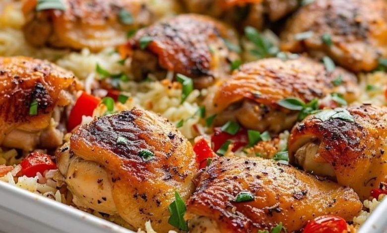 7. Bake: Place the seared chicken thighs on top of the rice mixture, skin-side up. Scatter the cherry tomatoes around the chicken. Cover the skillet or baking dish with a lid or aluminum foil, and place it in the preheated oven.