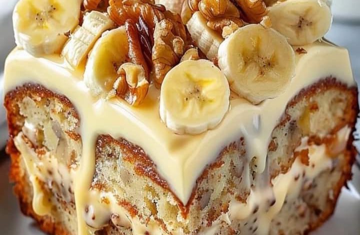 - Arrange the sliced bananas on top of the cake and sprinkle with chopped walnuts. Drizzle with caramel sauce if desired.