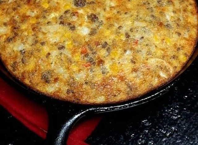 4. Combine and Cook: Pour the egg mixture into the skillet over the cooked vegetables and meat. Stir gently to distribute the ingredients evenly. Cook without stirring for about 5 minutes, or until the edges begin to set.
