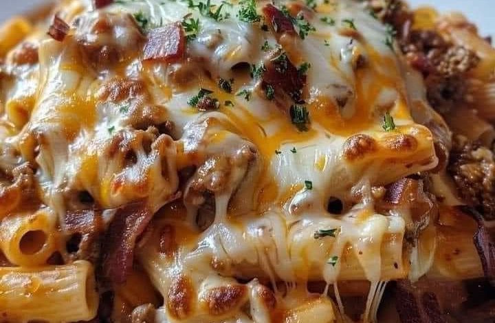 Cheesy Baked Ziti with Bacon and Ground Beef