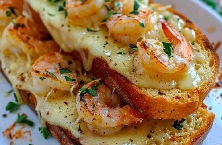 This cheesy garlic shrimp toast is a perfect appetizer or snack, packed with flavor and easy to prepare. Enjoy!