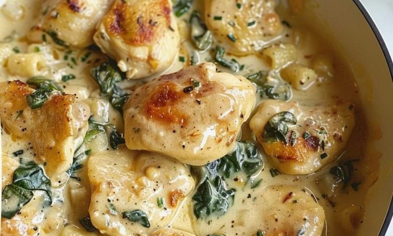 - Stir the cooked chicken and fresh spinach leaves into the skillet, allowing the spinach to wilt.
