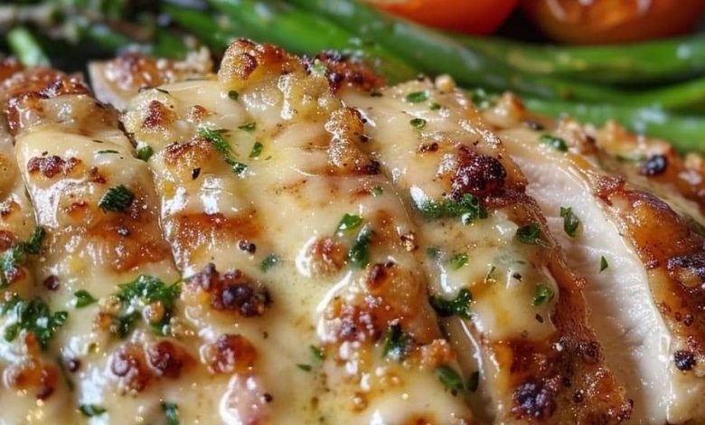 - Plate the creamy garlic chicken and spoon extra sauce over the top. Arrange grilled asparagus and roasted tomatoes around the chicken. Garnish with chopped parsley.