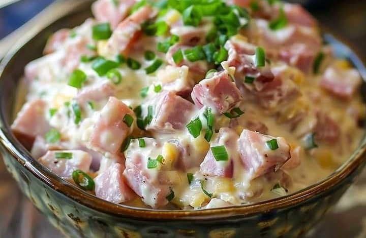 - Add the diced ham, shredded cheese, and chopped green onions to the bowl with the dressing. Stir until all the ingredients are well-coated with the dressing.