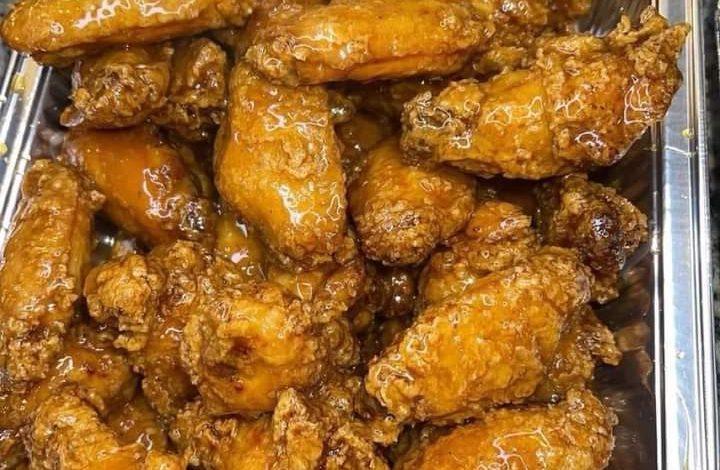 - Place the fried wings in a large bowl and pour the glaze over them.