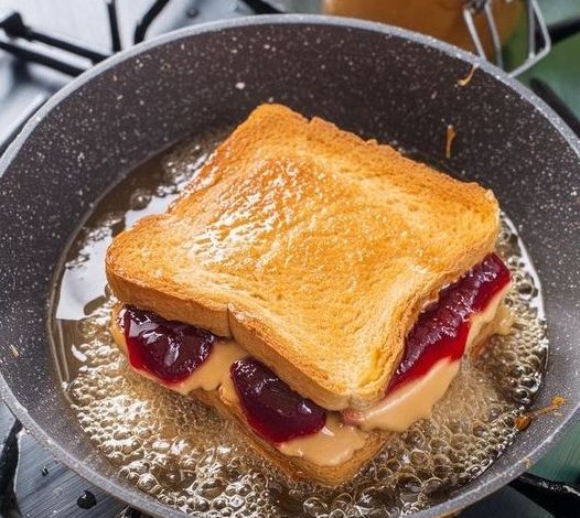 - Cook until the bread is golden brown and crispy, about 2-3 minutes. Carefully flip the sandwiches and cook the other side until golden brown and the peanut butter and jelly are warm and gooey, another 2-3 minutes.