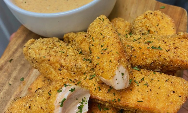 After cooking, place the fried salmon sticks on paper towels to drain off excess oil. For the