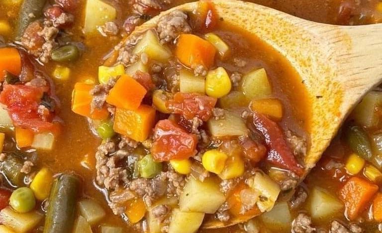 • Add the beef broth, water, diced potatoes, carrots, green beans, corn, peas, and diced tomatoes (with their juice) to the pot.