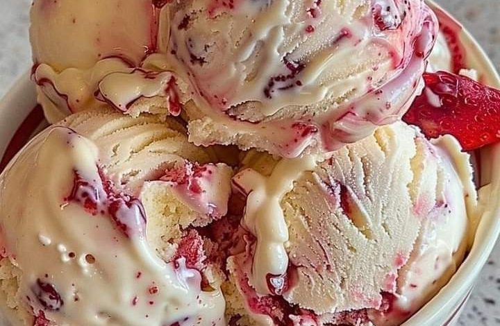 This homemade ice cream is creamy and rich, with a delightful swirl of sweet and tangy strawberries. It’s perfect for a refreshing dessert!