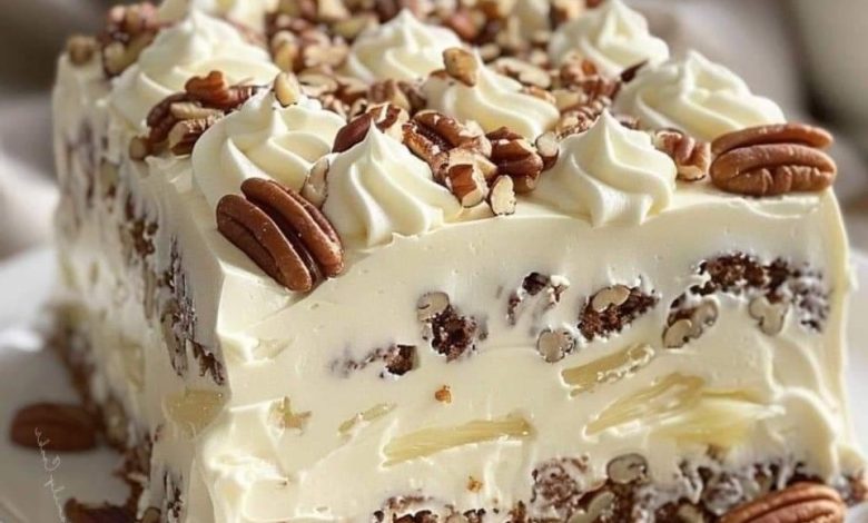 • Garnish the top of the cake with whole or chopped pecans, as shown in the image. You can also pipe some frosting on top for an added decorative touch.