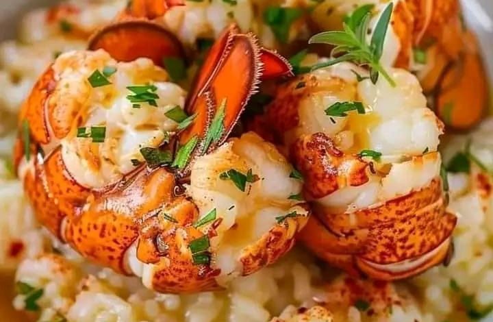 - Serve the risotto in bowls, topped with the baked lobster tails.
