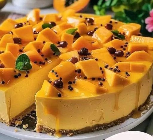 After the cheesecake is baked, carefully remove it from the springform pan, pour passion fruit on top and sprinkle fresh fruit or coconut on top if desired.
