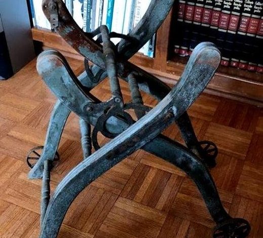 This piece appears to be a type of stand or support, featuring curved metal arms and wheels, which would have allowed for mobility and the support of a heavy object. The design suggests it could have been used in conjunction with another device or machine, potentially related to woodworking, blacksmithing, or another industrial craft. Such devices were common in the pre-electrical era, where manual labor and mechanical ingenuity were paramount.
