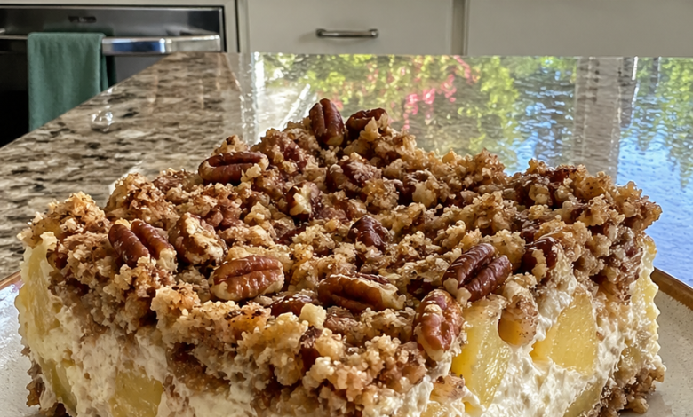 This Pineapple Pecan Cream Cheese Crunch Bake is an easy homemade dessert with a creamy pineapple filling and a buttery pecan wafer topping. It is sweet, soft, crunchy, and perfect for sharing with family or guests.