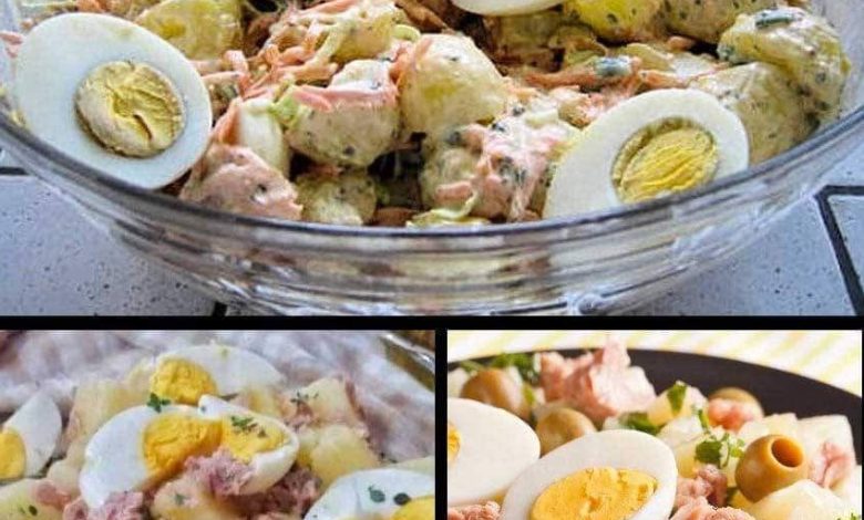 • In a large bowl, combine the cooked potatoes, flaked tuna or salmon, chopped celery, chopped red onion, grated carrots, and chopped parsley.