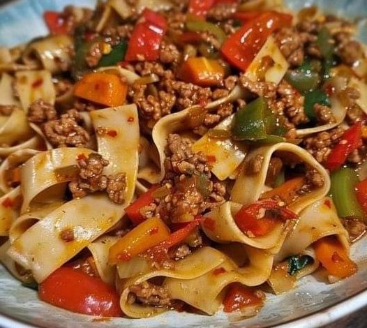 Spicy Stir-Fried Noodles with Ground Meat and Vegetables