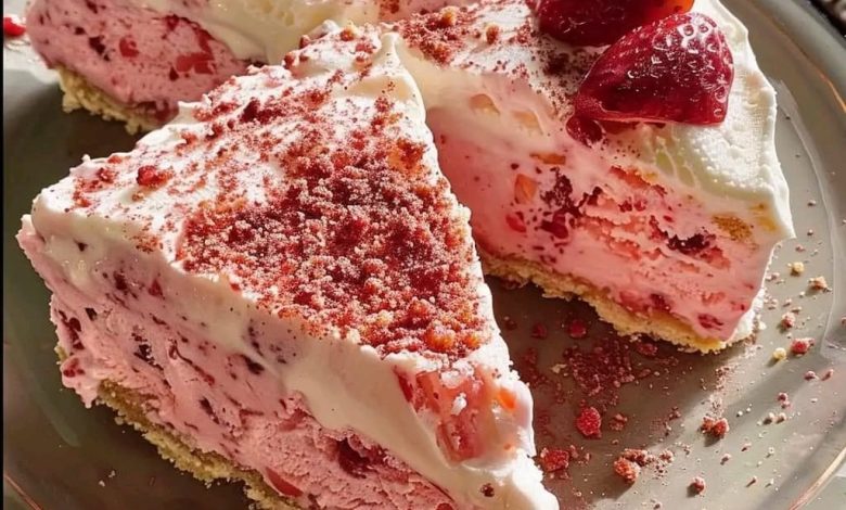 Last part: Mix the remaining 1.5 cups of vanilla ice cream in a bowl until smooth and spread over the strawberries. Sprinkle cookies and strawberry pieces evenly over top and press to seal.