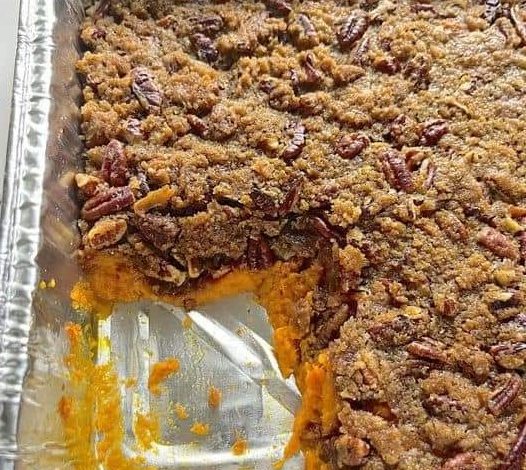 - Sprinkle the pecan streusel topping evenly over the sweet potato filling.
