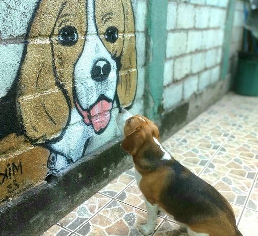 Beagles are known for their keen sense of smell and an insatiable curiosity that drives them to explore their surroundings. This trait makes them particularly responsive to new stimuli, whether it’s an interesting scent, a strange sound, or in this case, a painted image on a wall. The Beagle in the image is captured in a moment of inquisitiveness, as if trying to understand the face staring back at it from the wall.