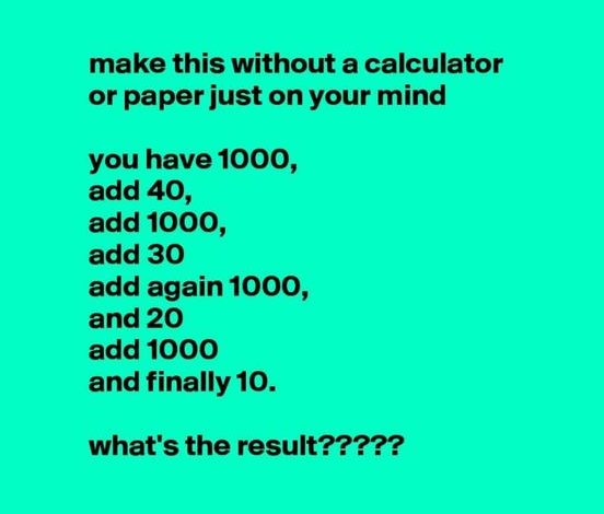 In an age where calculators and smartphones are readily available, mental math often takes a back seat. However, challenges like the one presented in the image can quickly bring us back to our basic arithmetic skills, testing not only our mathematical abilities but also our capacity for focus and attention to detail. At first glance, the problem seems straightforward: a simple sequence of additions that anyone should be able to solve in their head. But as many who attempt this challenge discover, the solution is not as simple as it seems.