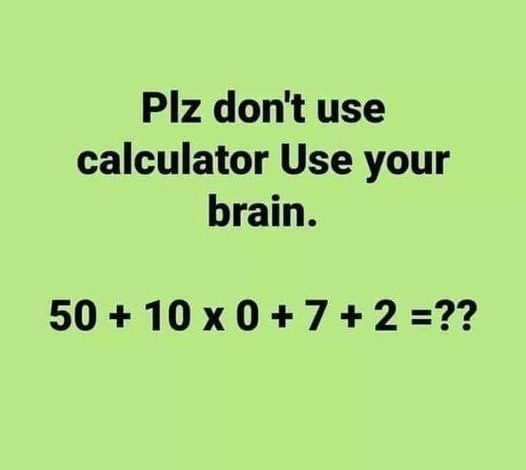 Mathematical challenges, especially those presented in the form of puzzles, often seem straightforward but can easily trip us up if we’re not careful. The problem shown in the image—50 + 10 x 0 + 7 + 2 = ??—is a perfect example of how the correct application of basic arithmetic rules is crucial for arriving at the right answer. This puzzle tests not only your math skills but also your ability to follow the order of operations, a fundamental principle in mathematics.