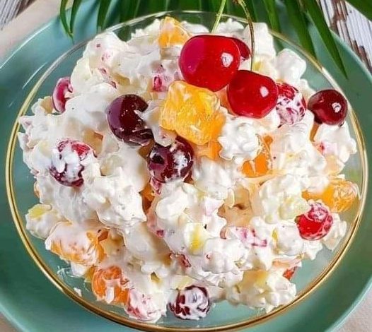- In a large bowl, combine the pineapple chunks, mandarin orange segments, halved cherries, mini marshmallows, and shredded coconut.